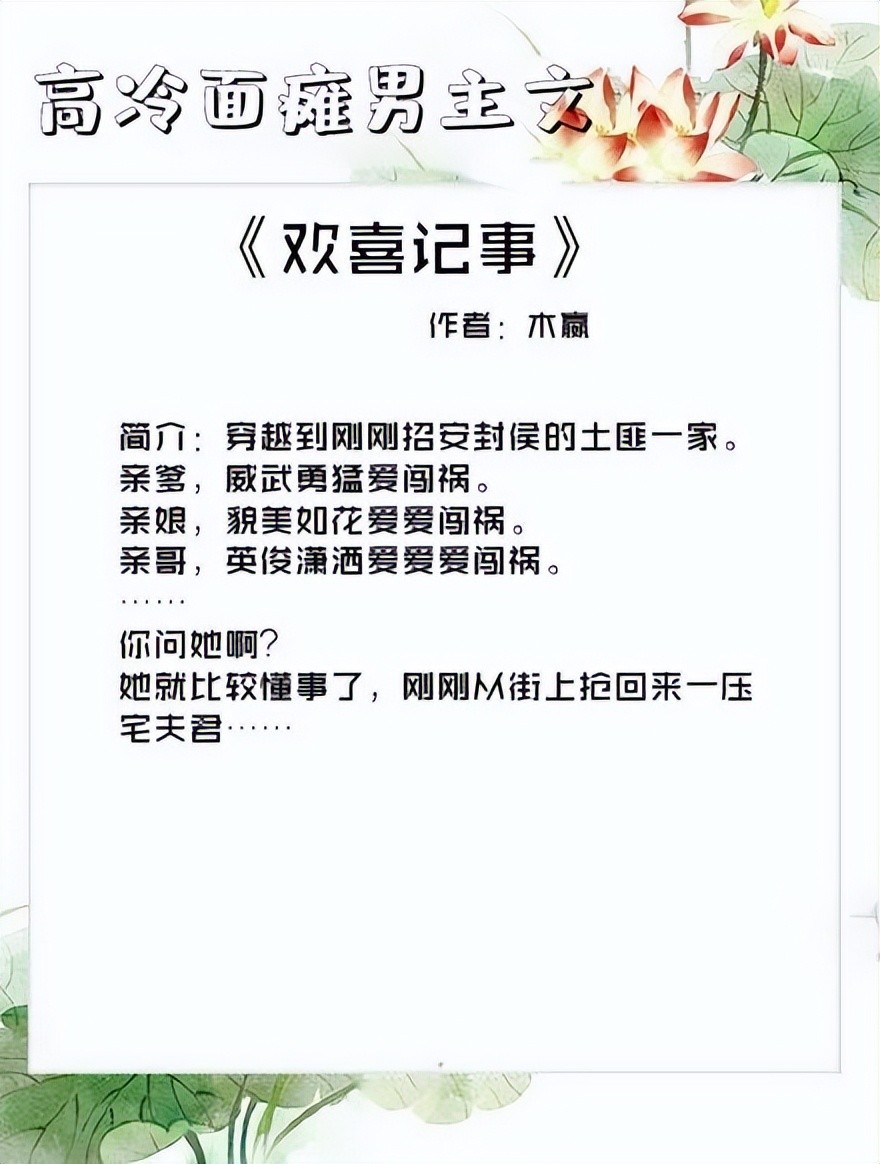 短书评:看文案就知道,女主比较现实,毕竟是要嫁给一个陌生人,为自己打算也无可厚非呀。也是篇温馨搞笑文,没有宅斗,女主认错夫君比较搞笑。