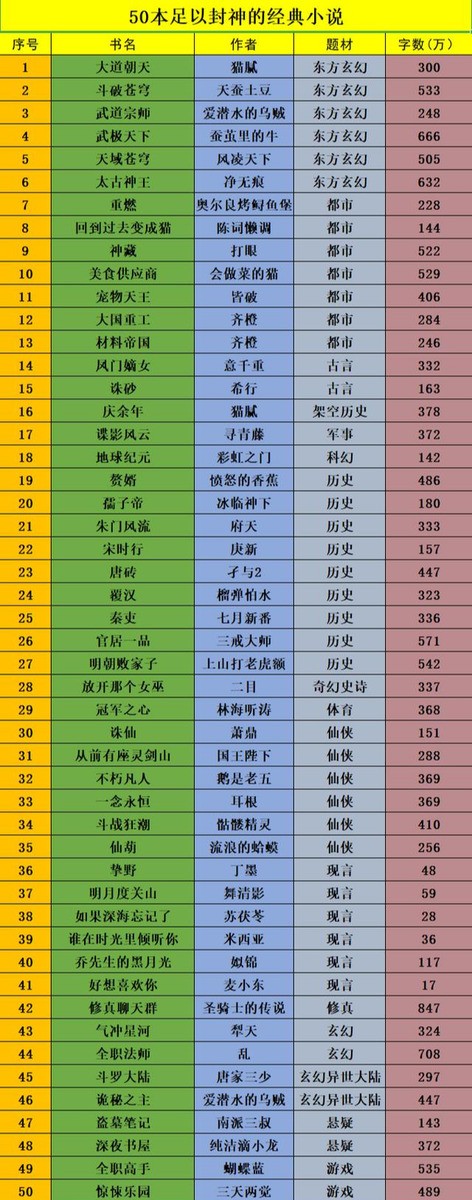 大家可以看到,这50本小说里有8本女频小说,剩下的全部是男频小说。这些小说都是经过时光洗涤,被公众认可的经典作品。作者也基本都是白金或大神级别的人物,想来作品的质量是绝对有保证的。