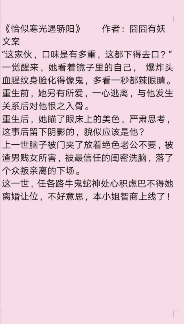 《恰似寒光遇骄阳》是很欢脱的文,里面有很多中二的男配,蠢萌蠢萌的。女主也是很跳脱的,男主很高冷,没办法,一遇到女主冰山就得融化。