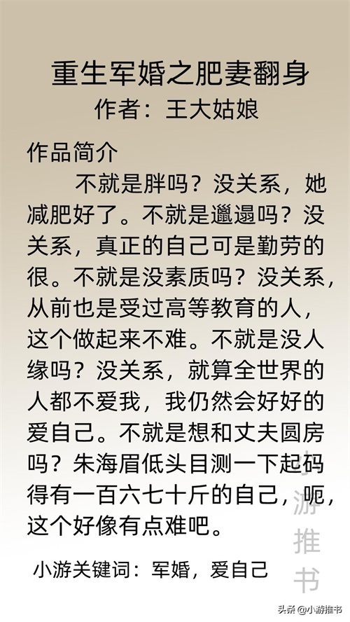 大家好,我是@小游推书,军婚小说在年代文里居多,军嫂与兵哥哥的感情好上头!今日精心为大家推荐三本女主重生的军婚文,剧情温馨,家长里短,女主重生后努力生活,与兵哥哥的爱情也是又甜又撩,是书荒者的福利,不要错过啦!赶紧收藏起来慢慢看吧。#小说##军婚##言情##年代文#