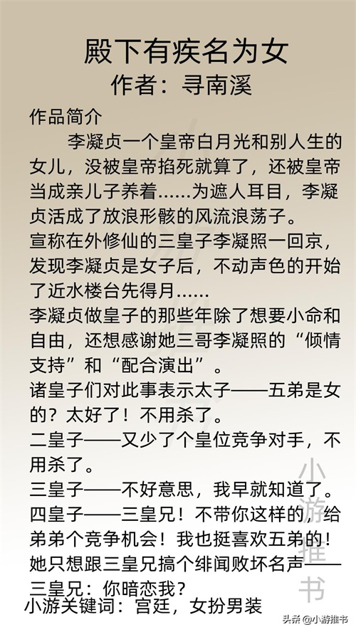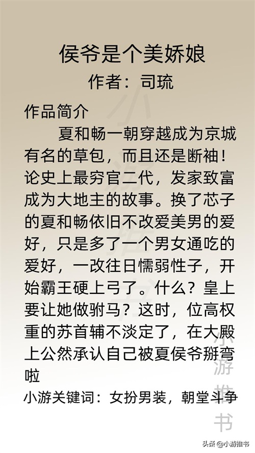 大家好,我是@小游推书,今日推荐五本女扮男装的古言小说,剧情好看,女主因家庭女扮男装撑起家族,或者为在古代好生存,和男主的互动也极其搞笑。书荒必备!#小说##小说推荐##言情##大家有什么n刷的小说,可以推荐一下吗#
