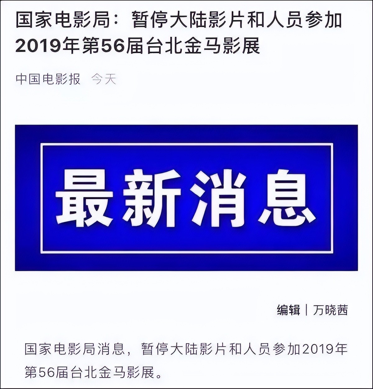 2019年,国家电影局通告,暂停内地影片和人员参加第56届台北金马奖影展,从此金马奖彻底没落,沦落成台湾电影人自娱自乐的一个小奖项。
