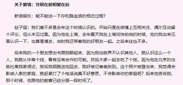 对此,赵子琪曾接受采访,一一作了否认。她表示与路金波的相爱,是在他与前妻分居之后,至于其他的传闻则完全是捕风捉影。不过,这样的回应并没有什么用,很多人依然不断攻击她,这次就又被翻了出来。