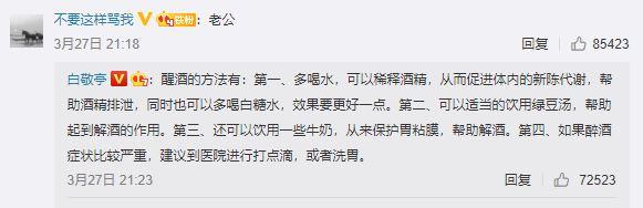 看到微博上有粉丝公开喊话自己做老公,白敬亭第一时间就上线回复了醒酒的方法有:第一、多喝水,可以稀释酒精,从而促进体内的新陈代谢,帮助酒精排泄,同时也可以多喝白糖水,效果要更好一点。第二、可以适当的饮用绿豆汤,帮助起到解酒的作用。第三、还可以饮用一些牛奶,从来保护胃粘膜,帮助解酒。第四、如果醉酒症状比较严重,建议到医院进行打点滴,或者洗胃,言下之意就是——这名粉丝你清醒一点吧!