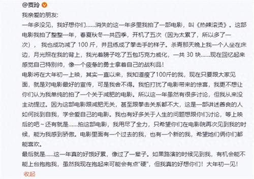 1月11日,贾玲在个人社交账号发表了一篇长文,就减肥和新电影等热点话题进行了回应。