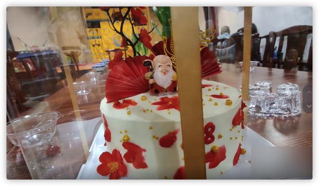门前的玻璃柜里放着一个红色蛋糕,上面摆着一个笑呵呵的寿星公。