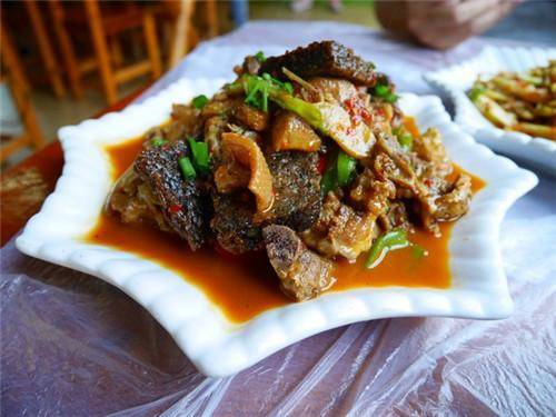 做土匪鸭没有一定的做菜规则好遵循,只要抓来特别能飞腾的鸭子洗剥干净,用湘西人喜欢的炒菜作料,胡辣辣做出来的,就成了。如果用鸭血和糯米结坨做成的血粑一起做,就成了血粑鸭。