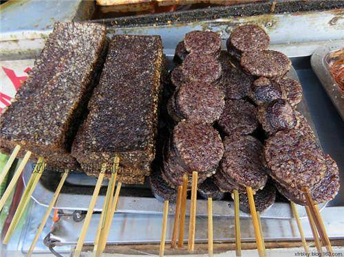 古城小吃摊上有单卖的血粑串,大多用猪血来做的,糯米也换成了饭米,不如和鸭子一起炒出来的香,没吃过的买来吃个新鲜还成。