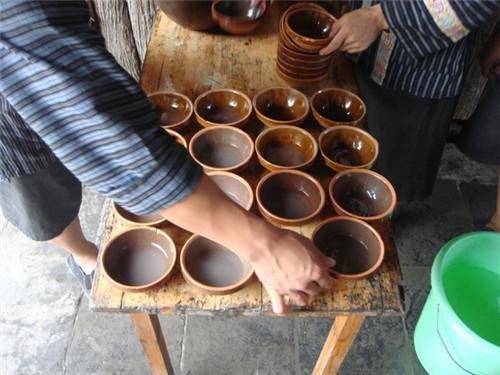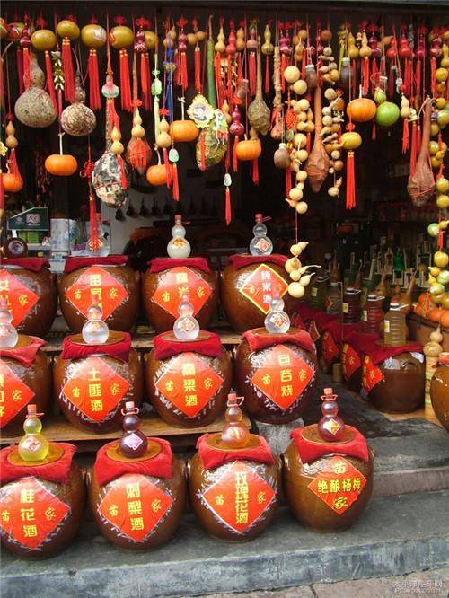 古城里很多店铺的店门就是酒坛子码起来的,一看就是批发零售来的,要喝到好苗酒,难。吃杯路边陶坛子装的甜酒解解馋吧。