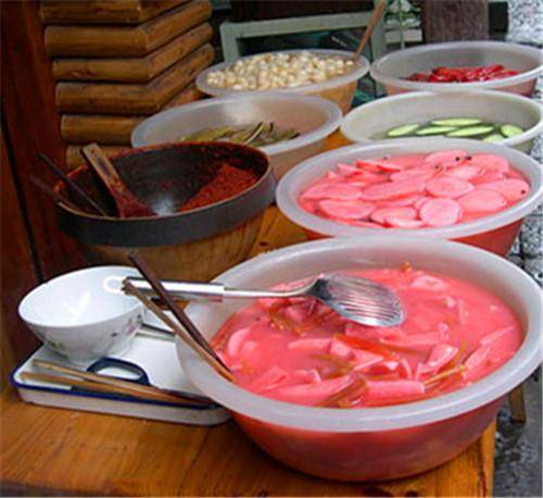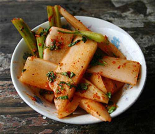 腌萝卜菜好吃,从盆里坛子里用无不沾油盐的筷子捞起来,小碗装好,倒一点酸汤搀和着,撒上辣椒盐和香菜,夏天吃可饿了。大街小巷都有的卖,好不好吃一要看颜色,泡菜的水浑浊一些也不要紧,清清爽爽的才需要怀疑味道是否好,当然也有可能店家就是担心你看到浊汤不雅观,才换的清盐水。