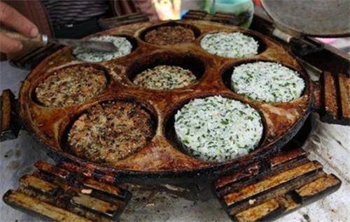 是从一种祭祀食品发展过来的吃食。小吃摊上卖的和祭祀时候用的出入挺大的,主要是材料也难找,也要看季节。通常摊上卖的就是用青菜叶子或是蒿子和腊肉炒炒,炒得油亮油亮的,再放到一个小蒸笼里卖,或是放到一个不锈钢屉子里,配着咸菜、辣椒吃,味道差不多,可当炒饭吃。