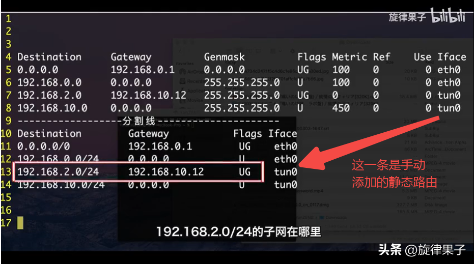 如果数据包的目的地是我的办公室的主机,IP地址为192.168.2.12,那么会同时符合两个目的网段,0.0.0.0/0和192.168.2.0/24,但是路由器会优先匹配更精确的规则,所以数据包通过tun0网卡转发给网关192.168.10.12。