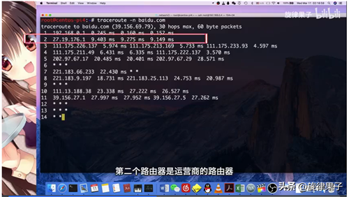 我们在centos系统中,可以使用traceroute -n http://baidu.com的命令查看中途经过了哪些路由器。我们很清晰地看到,第一个经历的路由器就是我们自己的路由器192.168.0.1,第二个路由器是运营商的路由器,27.19.176.1,中间的路由器都是城市路由的节点。