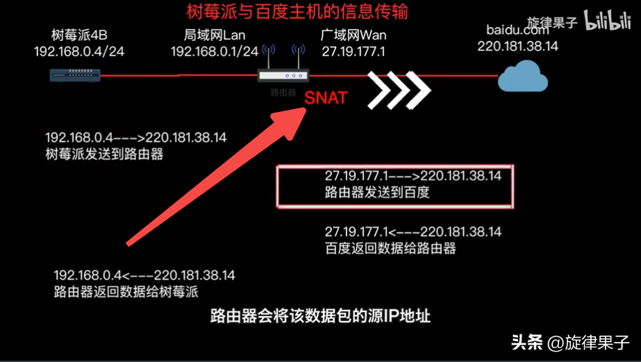 NAT的全称是Network Address Translation,S的含义是source,也叫IP伪装技术。我们知道,局域网主机ip地址192.168.0.4/24是一个私有地址,可能邻居家也有这个地址。假设发送到公网的地址也是用这个地址的话,主机要给我们返回数据包的时候,由于目的地址是私有地址,中途根本不知道会传到哪里。所以,数据包在出路由器之前,路由器会将该数据包的源IP地址伪装成路由器WAN口的公网IP地址,这样想要返回数据包时,目的地址是公网IP地址了,数据包就能顺利传回来了。路由器收到传回来的数据包后,会自动做目的地址转换DNAT,将目的地址从公网IP转换为刚才发送消息的主机192.168.0.4,这样内部主机就能顺利接收信息了,路由器内部所有的设备也都能通过这种方式上网了。