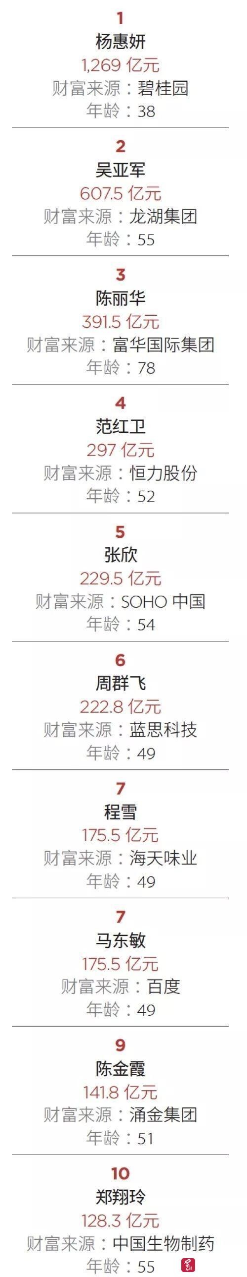 其中,碧桂园的联席主席杨惠妍仍以1269亿元财富再度蝉联中国最富有女性榜榜首,她也是榜单前十名中最年轻的女富豪,年仅38岁。