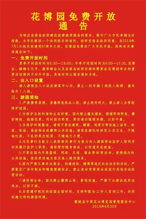 花博会、二梅展、康养峰会以及县委县政府安排的需要在花博园举办的重要活动期间不对外开放,具体时间以公告通知为准。