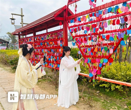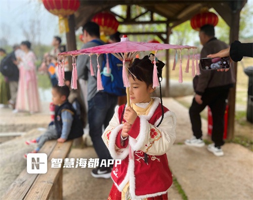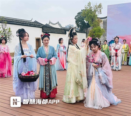 绿衣红裙的孩子们歌舞表演如朵朵荷花绽放,身着汉服的青年男女在袅袅轻歌与姹紫嫣红里行“簪花礼”,将花朵簪在发际,向春日百花行礼,传达自己的美好祝愿。而后,他们在古厝与园林之间巡游,让身上的汉服与古老的建筑辉映成一道独特的风景线。