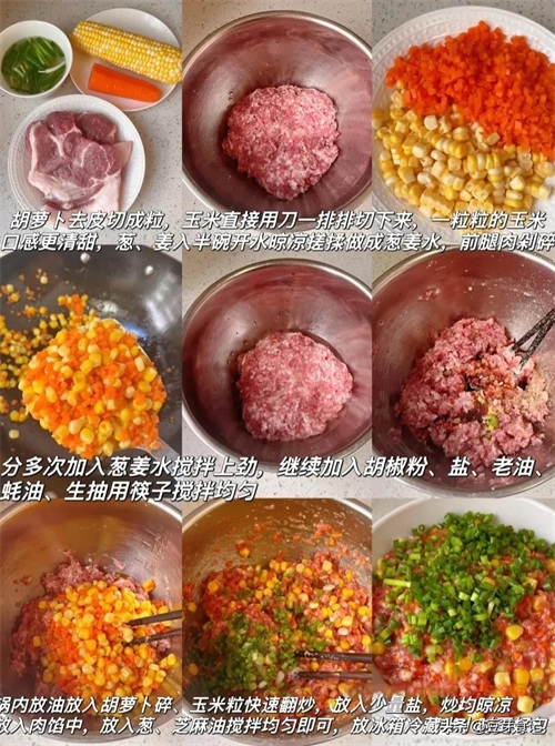准备食材:玉米,胡萝卜,猪肉末,葱姜。