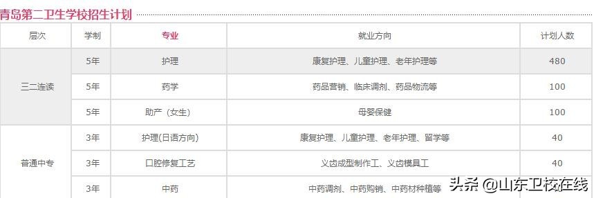 山东青岛胶州卫校设有护理、助产、药剂、口腔修复工艺等中职专业。经山东省教育厅批准,面向山东省内招收护理学、临床医学、口腔医学技术、药学等“三二连读”高职专业。