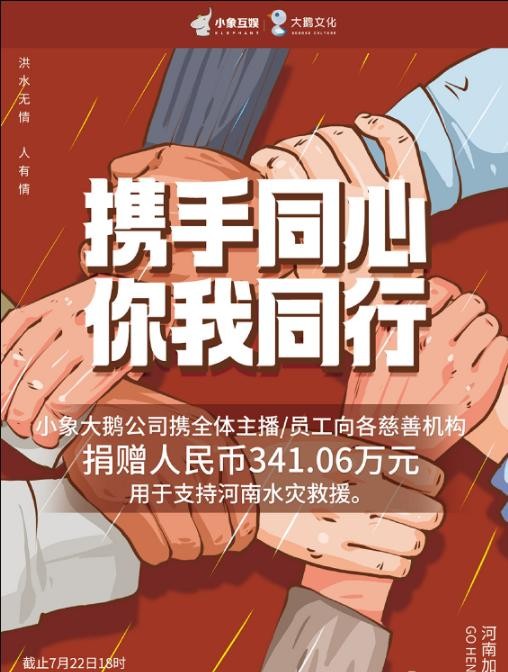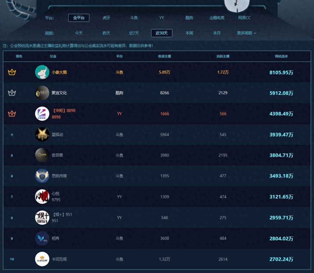 受六月末斗鱼粉丝节与七月初YY平台年度公会预选赛影响,近三十天公会流水排行榜中,以斗鱼YY为主导,入围公会频道比例为6:3,剩余一个名额由酷狗常青树聚宜文化拿下。斗鱼小象大鹅持续稳坐榜首,流水高达八千万元,是小象大鹅的“当家门面”,而小象大鹅公司在这次河南灾情中,亦是携手旗下主播捐款高达341万元(截止7月22日18时的统计数据)。