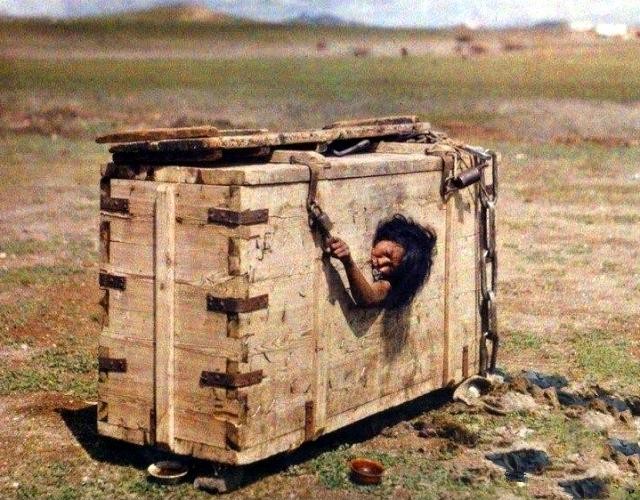 图5:【墪锁刑】这张照片中就是清末蒙古地区的墪锁刑。这种刑罚主要在蒙古地区惩罚不守妇道的女犯使用,具体内容就是用木板把犯人卡在木箱里,只留出一个洞来放犯人的手臂和头,这样的话犯人就只能呼吸吃饭,无法动弹,上厕所也只能在箱子里,十分折磨人。