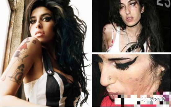 左边的艾米·怀恩豪斯可是第一个获得五项格莱美奖的英国女歌手,才华横溢,风光无限,可染上毒品后就成了右图的模样,虽进行了戒毒治疗,但不幸的是,最后因为饮酒过量去世,年仅27岁。