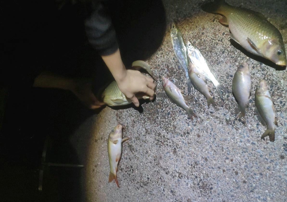 傍晚下班吃过晚饭以后,小郭就带着鱼竿去江边钓鱼,钓到晚上9点已经收获了几尾鲤鱼,还有几条小鱼,对于他这个刚学钓鱼的新手来说,能钓到鱼,有这样的收获已经很是满意了。