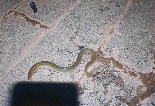 莫不是钓到蛇了吧!赶紧拿着手电照了一下,这一照把他吓了一跳,这是蛇还是鱼啊!看了好久又不太像黄鳝,黄鳝虽说他没吃过,但也认识,这鱼身形是差不多,但颜色根本就不一样。