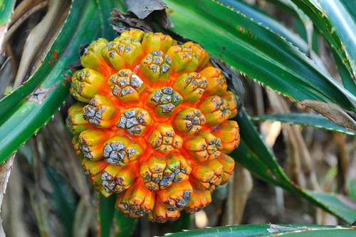 这种水果生长于一种灌木植物,外形看起来有一些些像菠萝,成熟之后是橘黄色的,表面也会有一些软软的小刺。拨开以后,里面的颜色也是很诱人,黄绿渐变,从视觉上就给人一种愉悦感。很多的条状果肉一颗颗粘连在一起,用手一瓣就可以,不过吃的话,还需要吐渣,就像是吃甘蔗一样,最最里面是一个果核。