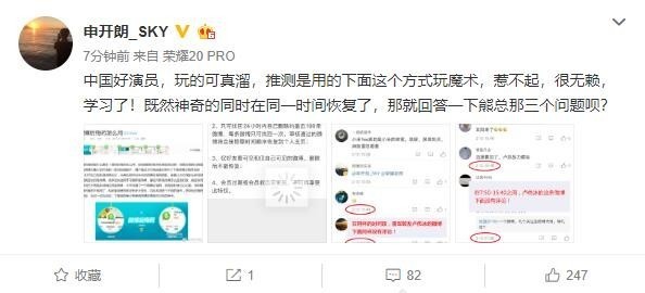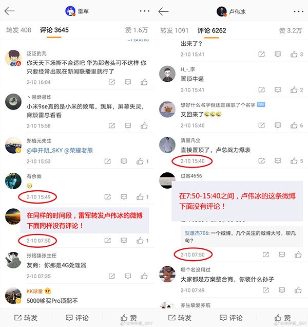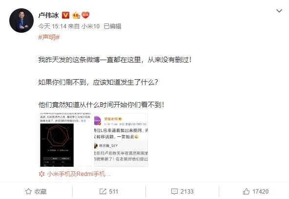 在@荣耀老熊 2月9日晚发出三个疑问之后,卢伟冰和雷军的那条微博曾一度无法查看,但又都在今天突然恢复。卢伟冰在2月10日专门发表了一则声明,表示自己从来没有删除过微博。@申开朗_SKY 则在微博上回应称,既然微博恢复了,就回答一下@荣耀老熊 的三个问题吧。