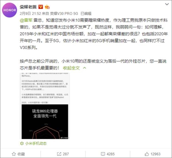 可见,小米10的意义不仅仅是一款旗舰手机而已。不过对于V30的销量问题,荣耀方面显然有着不同的看法。2月9日晚,@荣耀老熊 回应称,如何理解2019年小米和红米的中国市场份额总和不及荣耀?为何小米和红米的5G手机销量总和不及荣耀V30系列?小米10的芯片为何会采用外挂形式?