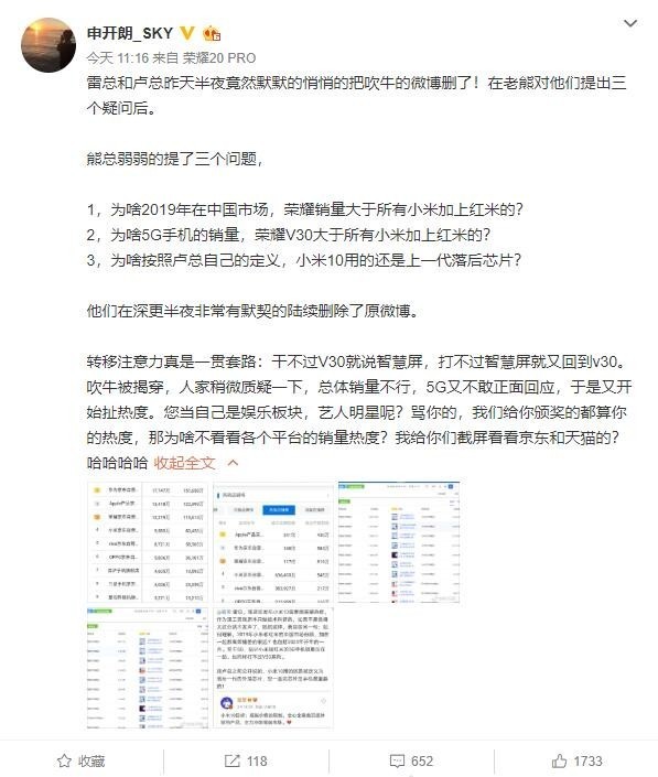 京东天猫店铺数据佐证 荣耀老熊微博三连问回应小米