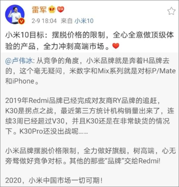 【手机中国新闻】日前,小米集团副总裁卢伟冰曾表示,K30销量已经连续三周超过V30。而对于小米10的目标,雷军表示将摆脱价格的限制,全心全意做顶级体验的产品,全力冲刺高端市常