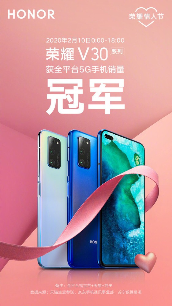 在2月10日0: 00—18: 00,荣耀V30系列斩获全平台5G手机销量冠军。值得注意的是,这个“全平台销量”指的是各个平台销量的总和,而且荣耀没有在海报中特别标注价位段,这意味着这是一个与各个价位段5G手机竞争出的结果。从这个角度来说,荣耀V30系列的表现还是相当突出的。