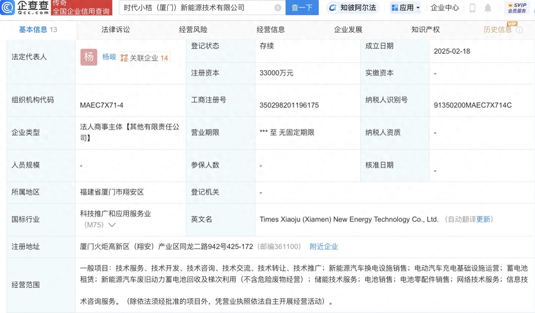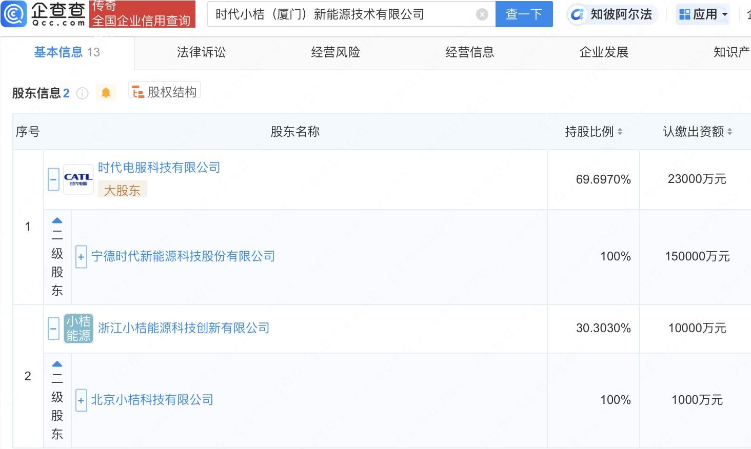 企查查APP显示,近日,时代小桔(厦门)新能源技术有限公司成立,法定代表人为杨峻,注册资本3.3亿元,经营范围包含:新能源汽车换电设施销售;电动汽车充电基础设施运营;蓄电池租赁;电池销售等。企查查股权穿透显示,该公司由宁德时代(300750)、滴滴出行关联公司北京小桔科技有限公司间接共同持股。