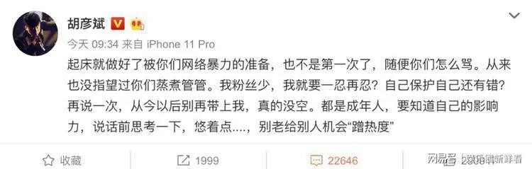 胡彦斌得知此事后则发微博痛斥郑爽,说她不断拿前任出来开涮,动不动就要提起自己,还要按照套路和营销号一起给他扣帽子,胡彦斌说“这锅我不背”,还专门发一条微博回应“我也搞不定东北女人,请不要再提了”。这一大胆的举动却是引起了很多女方粉丝的不满,他的这条微博下面几乎被女方粉丝占领,自然是骂声一片。