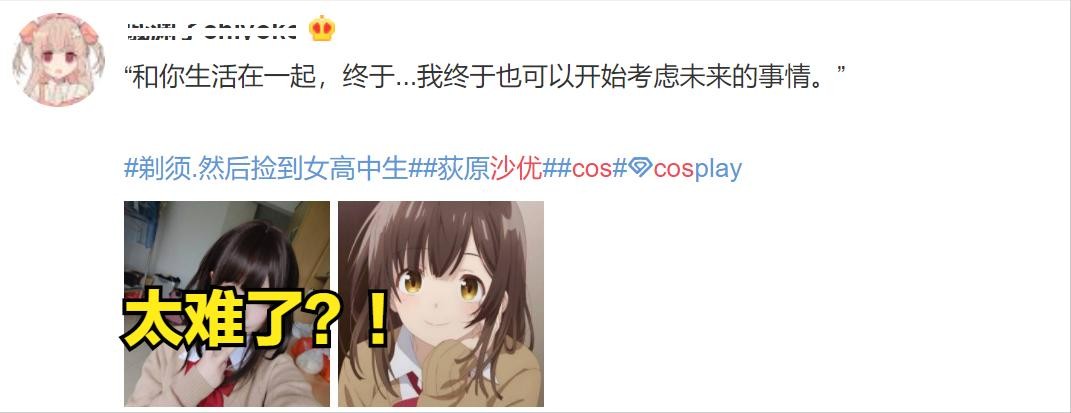 4月新番《剃须》开播后走入了不少漫迷眼中,从数据上来看看番的人会偏向男性居多,或许对角色容易产生同理心,从而引发过不少“破防”or争吵事件,女主沙优也变成了人气的争议角色,有位未成年的小姐姐则随着热度COS一波沙优,这颜值和气质确实很养眼,不过后续发展歪了?她被冲了。