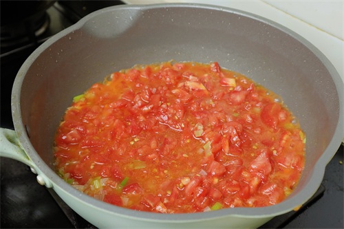 第三步:锅里倒油烧热,放入葱花爆香,倒入西红柿翻炒均匀,加食盐转中火烧三分钟。提前加盐更容易炒出西红柿汁,炒至西红柿完全出汁,加入适量白糖提鲜。