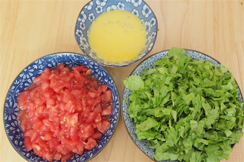 第二步:西红柿用手撕去外皮,先切片然后切成碎丁,把生菜切块装入盘中备用。碗中打入两颗鸡蛋,搅拌成鸡蛋液,蛋液一定要充分搅匀,才能打出漂亮的蛋花。