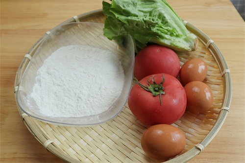【所需食材】:普通面粉120g、三颗鸡蛋、一把生菜、两个西红柿、白糖、白胡椒、鸡精、盐、香油。