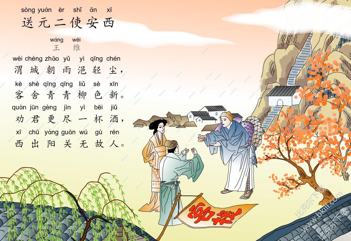 此诗前两句写送别的时间,地点,环境气氛,为送别创造了一个愁郁的氛围:清晨,渭城客舍,驿道,柳树。“朝雨”下得不长,刚刚润湿了尘土就停了。从长安西去的大道上,平日车马交驰,尘土飞扬,而送别的时候,朝雨乍停,天气清朗,道路显得洁净、清爽。“浥轻尘”的“浥”字是湿润的意思,仿佛天从人愿,特意为远行的人安排一条轻尘不扬的道路。客舍,原本是羁旅者的伴侣;“柳”与“留”谐音,是离别的象征。从清朗的天宇,到洁净的道路,从青青的客舍,到翠绿的杨柳,构成了一幅色调清新明朗的图景,为这场送别提供了典型的自然环境。这是一场深情的离别,但却不是黯然销魂的离别。相反地,倒是透露出一种轻快而富于希望的情调。“轻尘”“青青”“新”等词语,声韵轻柔明快。