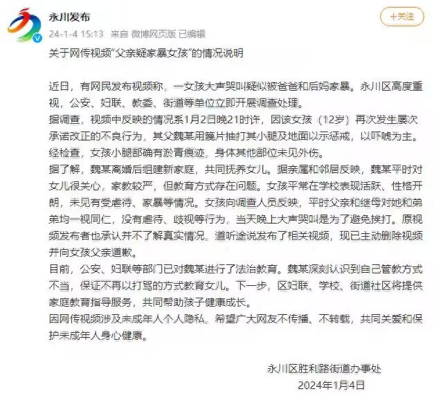 在网友的舆论下,该地妇联随即发表了调查声明,其结果却令大家瞠目结舌。妇联表示,是因该女孩屡次不改不良行为,其父亲魏某便用篾片抽打其小腿以及地面以示警戒。并且经调查,该女孩小腿确有淤青。