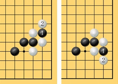 1.每一个棋子的气都要珍惜。每一个棋子都代表着一次着手权,珍惜自己的权利,不要视如草芥。每一个棋子都有与生俱来的生命力,其生命力很强,对手消灭他,“四子提一子”,要消耗四倍的着手权。每一个棋子都是“天生我材必有用”,只要不被提净,就有存在的价值,都要使其效率最大化。在劫争中,即使暂时被提,只要还有提回来的机会,生命力就还在。每一个棋子及其队友连接在一起形成团队,就是棋形。大概率情形是:气长的优于气短的。愚形三角被断定为恶形的理由之一就是气短。愚形三角7气,而棒形的三子8气。方四可视为重叠的愚形三角,8气,而棒形的四子10气。气长的棋命长一些,这个道理显而易见。一般剖析愚形的教科书,都是根据效率而论,言之有理。而笔者之说,似乎并不多见。如果权作效率论的补充,当无大错。