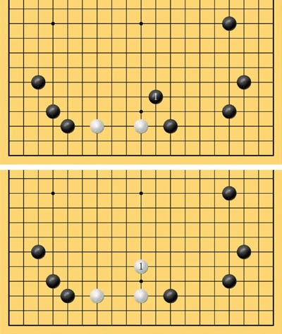 4.“两打同情不打”,这是一句有内涵的格言,务必认真领悟。对方有两个断点时,意味着有两处可以打吃。一旦打吃了其中一个,同时就失去了另一个。这就需要权衡利弊,慎重定形。保留变化余地,不愿轻易失去余味,在日语里叫“打惜”——舍不得下,高手往往喜欢保留余味,正因为他们算路广而深,看到了各种变化的可能性,也许内心正在判断得失。但是定形的良机往往稍纵即逝,不会永远放在那里等人选择。这正是围棋的妙处和难处。