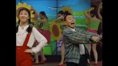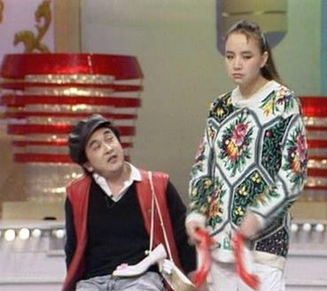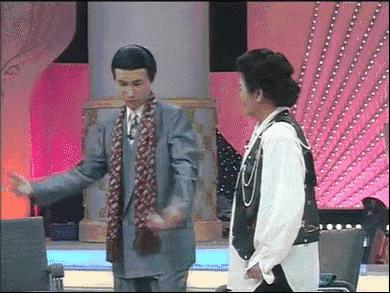 巩汉林扎着小辫,脖子带着一条花色围巾,在台上扭,赵丽蓉跟着他一边扭一边唱: