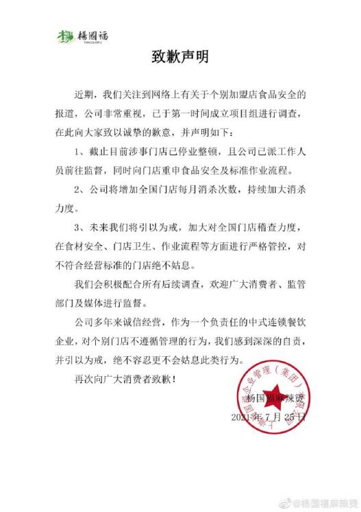 在微博曝出后,杨国福立即发布道歉声明,将涉事门店停业整顿,并派监督人员过去查看,同时向所有门店重新说明食品安全和操作流程。