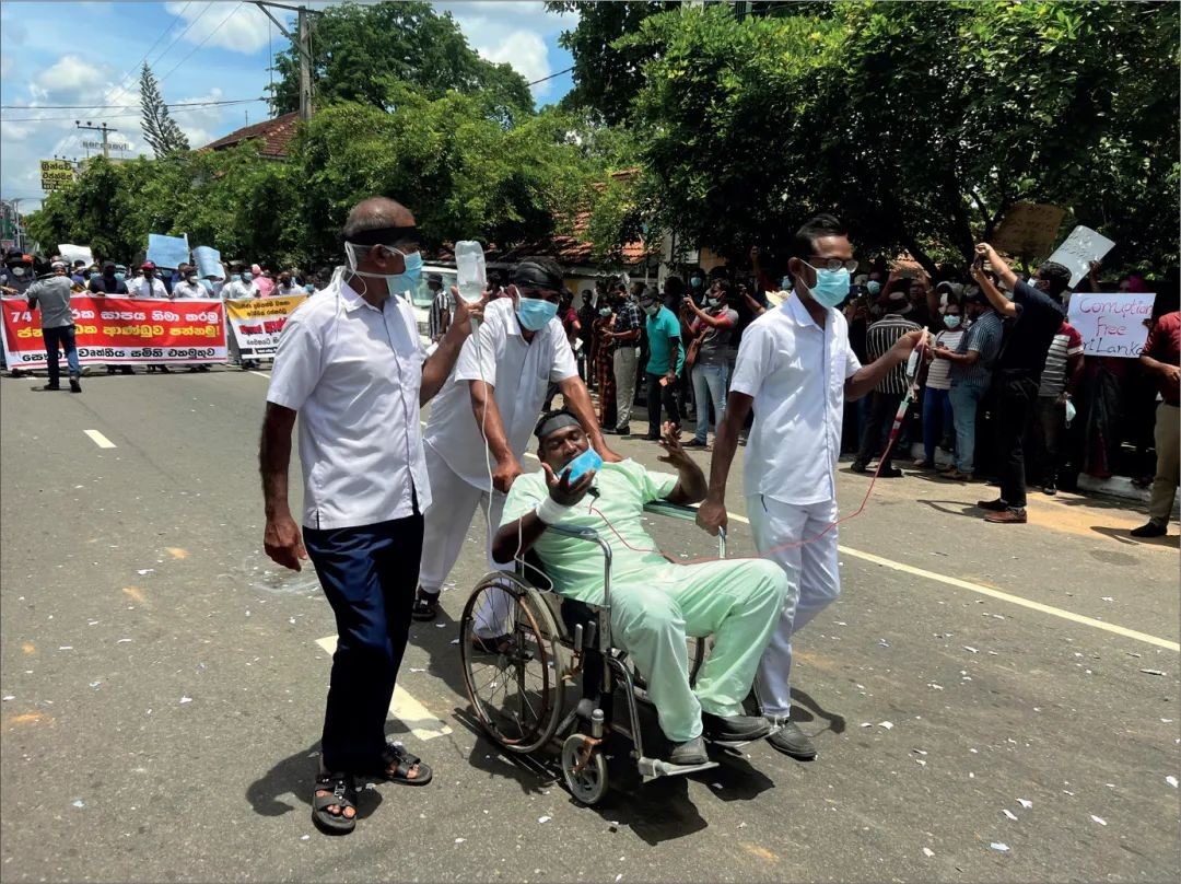 2022年,斯里兰卡经历了过去几十年来最严重的经济危机。教育和卫生体系等基本服务受到了影响,抗议活动指责政府治理不善和腐败。在这张照片中,参加抗议活动的医护人员象征着由经济危机导致的斯里兰卡卫生系统的紧急状况。这张照片拍摄于一家城市三级医院前。医疗卫生工作者要求给予卫生系统更大的优先地位。其中一个人是病情严重的患者,其他人试图治疗他。他们的目的是提高公众对这种情况的认识,同时呼吁政府关注卫生系统的危机。