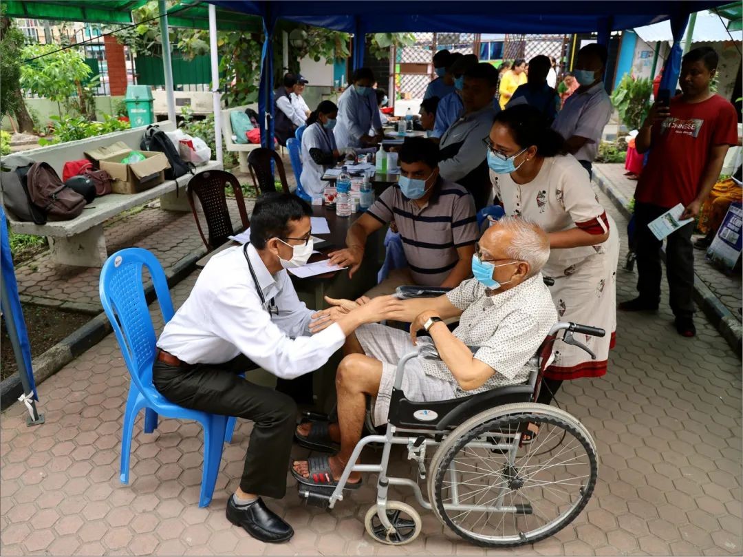 B. P. Koirala健康科学研究所是一所自治的健康科学大学,位于尼泊尔东部的Dharan市。虽然广泛配备了设施,但由于照护需求较大,床位几乎从不空置。患者很难去到其他医疗照护机构,因为最近的机构位于远在25英里外的Biratnagar市。这张照片突出了残疾老年人在获得医院照护方面可能面临的困难,以及卫生专业人员在医院之外和社区内为这类患者提供服务的不懈努力。