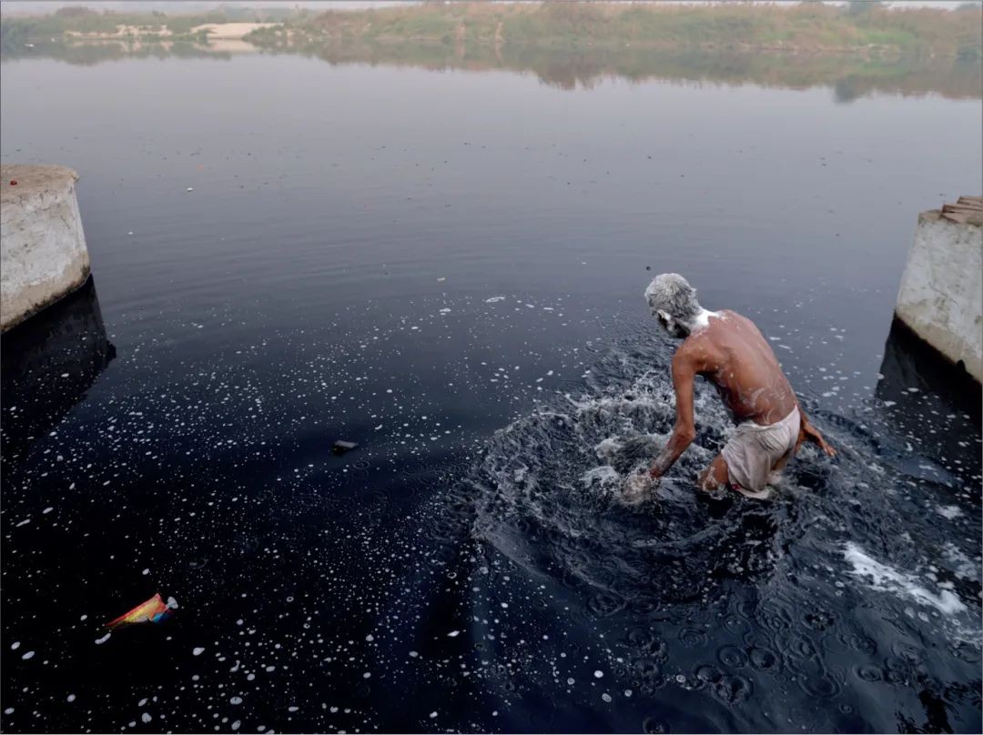 水是人类生存的必需品,我们生活的诸多方面都需要它。然而,人为干预正在导致水资源稀缺,影响了现有水资源的使用安全。照片拍摄于印度新德里的亚穆纳河(Yamuna),照片中的人被迫选择在明显被污染的河水中洗澡。在世界各地,许多弱势群体仍然无法获得安全的饮用水、卫生设施和个人卫生服务。水污染对人类健康和生物生态系统都有影响。在被污染的水中洗澡,照片中的人不仅面临着皮肤疾病、水传播感染和化学危害的风险,而且会在无意中进一步加重水污染。河流和人类的命运深深交织在一起。现在污染已经很严重了,我们每个人都需要采取行动,保护水体,解决各级水污染问题,确保每个公民都能获得安全用水。