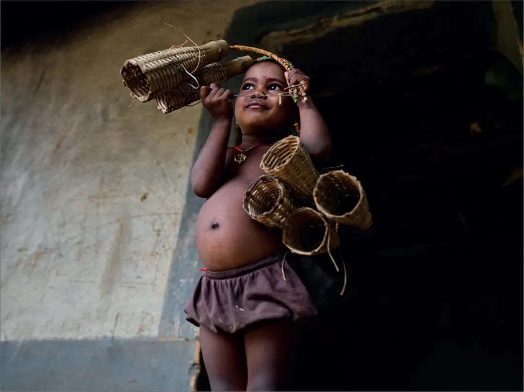 这张照片拍摄于印度东部西孟加拉邦普鲁里亚的一个偏远村庄。这个年幼的孩子来自Shabar社区,这些土著人民的社区受到贫困和社会经济困难的影响。村里的一些人营养不良,包括母亲和她们年幼的孩子。这个孩子手中拿着的是竹子做的捕鼠器,是用来捕食的,因为在这个偏远的农村地区,一些居民几乎负担不起饲养家禽等动物的费用,鱼类也很稀缺。亟待解决这些人面临的更广泛的不平等问题,包括需要充分的营养和改善这些边缘化社区的社会经济地位,以支持儿童的健康和福祉。